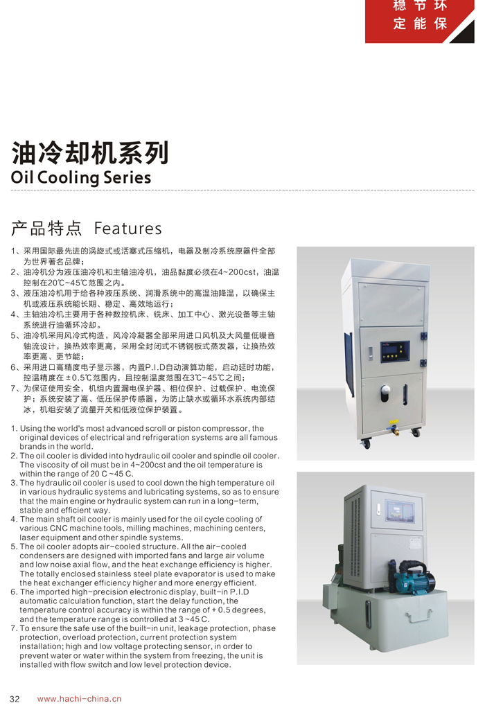 1、制冷能力是在環(huán)境溫度35℃,進油溫度35℃,出油溫度30℃,油品為ISO VG32條件下測得。 2、用戶在選擇油冷機時,必須選擇油液需控制的溫度范圍(1)18℃-25℃ (2)25℃-35℃ (3)35℃-45℃ (4)45℃以上。本公司推薦液壓油合理的溫度控制范圍為35℃-45℃. 3、油冷機吸油口必須用硬管連接,且加裝過濾器。 4、吸油管長度不應超過1.5米,如超出必須加粗吸油口。 5、油冷機吸油口應靠近設備回油口,出油口應靠近設備供油口。 6、如吸油口太長,需將油泵與機組分離。 7、以上機組使用環(huán)境為5~42℃,42℃以上屬高溫機組,外形尺寸及相關參數會有所變更,請選型時注意。 8、參數表內為本公司標準機型,本公司接受客戶特殊訂貨。 適用種類: ◇ CNC車床、銑床、磨床、拉床 ◇ CNC旋轉臺、油壓機、木工雕刻機 ◇ CNC立式/臥式加工中心、綜合切削加工中心 ◇ 高速機械主軸、電主軸、靜壓(動靜壓)主軸 ◇ 各種機械的液壓站及潤滑系統(tǒng) ◇ 放電加工設備.